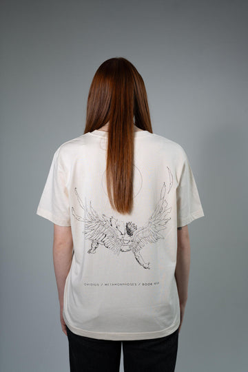Secondo il mito, Icaro volò via dal labirinto di Creta con le ali che suo padre Dedalo aveva costruito per lui. Ma, avvicinatosi troppo al Sole, la cera si sciolse e Icaro cadde morendo in mare. Il volo di Icaro simboleggia il desiderio di liberarsi dai vincoli mortali, ed è una potente allegoria che ci ricorda la finitezza umana e come le nostra eccessiva hybris ci possa trascinare nel caos. In questa visione, Icaro è raffigurato in caduta verso il proprio fato, dopo aver cercato invano di sovvertire le leggi che governano la natura ed il mondo.